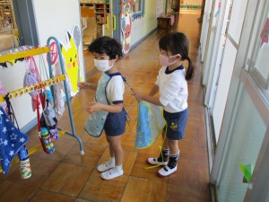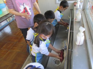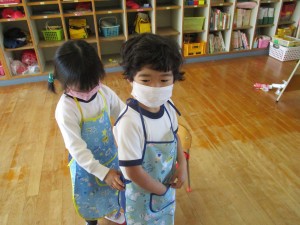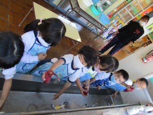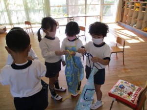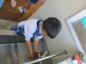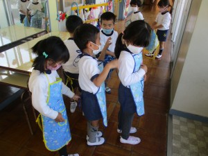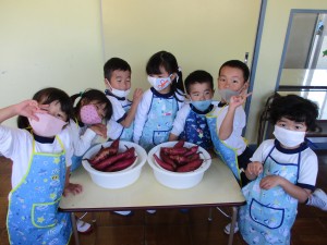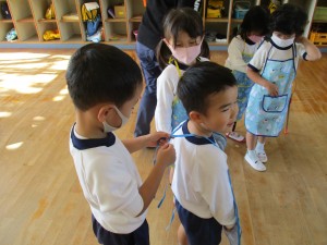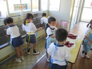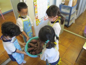 明日のお芋パーティーのために今日はちびっこコックさんになって、サツマイモを洗いました!エプロンをするとき、お互いに助け合う、してあげようの気持ちがみられとても微笑ましかったです。特に年長さんが、進んで、「してあげる」とまだ練習中の子も一生懸命結んでくれていました。