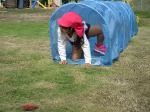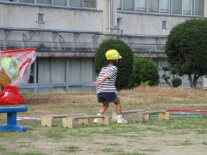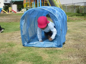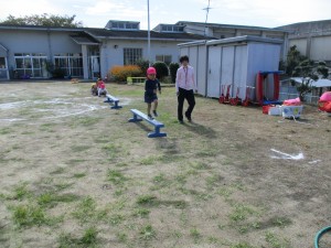 秋になっていろいろな体育遊具を並べて遊んでいたこどもたち。「な~先生これもママに見せたい!」「僕もお家の人に見せたい!」