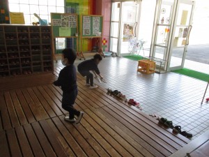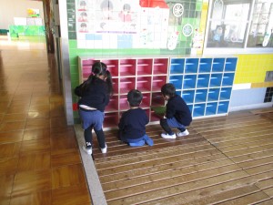 年中さんは、小さいほうきで靴箱をきれいにするよ!靴をきれいに並べて、靴箱ひとつずつ丁寧に角までしっかり!