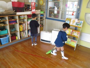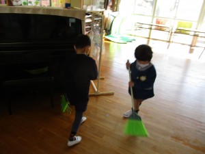 年長さんはほうきの持ち方も様になってきて、どこにごみがたある?と確認しながらきれいにはいて、ごみを一か所に