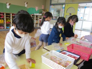 明日のお別れ遠足のおやつをお買い物しました!かわいいねこちゃんのお金を銀行で200円分お財布に入れて、