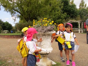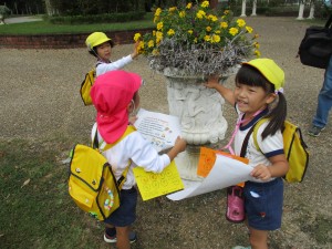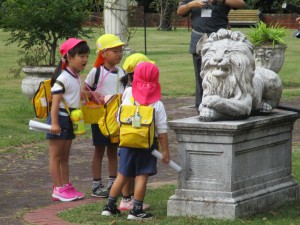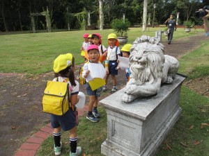 天使の石像にタッチしたり、ライオンに「がおーっ」と言ったり、人の模様の植木鉢を見つけたり・・・