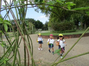 ♪どんぐりころころを歌いながらトンネルを歩くグループと♪まつぼっくりを歌うグループそれぞれ声を合わせて広い所に歌声がかわいくひびいていたよ!!