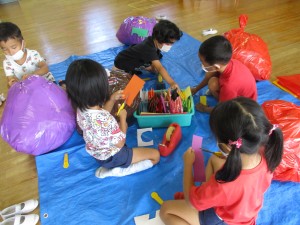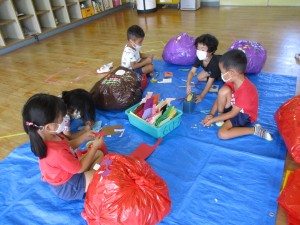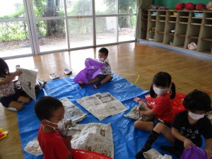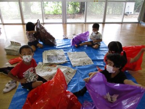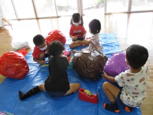 「先生大きい袋ある?」「紫の袋ほしいな」「僕は赤」と、どうやら、せっかく作った新聞紙のものを、袋に入れてさらにそこにまだまだ、新聞紙を丸めて入れて、大きくするようです!登園してきた子から、改良していると、次々とみんなが改良しだして、カラフルさと大きさが、