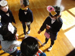 朝来ると、「先生今日もももたろうごっこするよね?」「刀がいるねん」とイメージが広がり、登園して用意が終わると、自分が使いたいものをつくっていました。お面を付けて、小物も作って、いざ、劇ごっこの時間になるとなりきって楽しんでいます。
