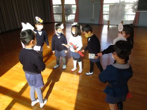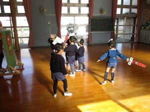今日は回るものが苦手な鬼が登場!すると、みんな、「こまかなぁ❔」とこまを取りに行き、全員が鬼をやっつけるために!とこま回しを繰り返し頑張りだしました。回らなくても、根気よく、友達と励まし合いながら頑張っていました。年中さんはもう完璧に回せますが、年長さんは、紐の巻き方、こまの投げ方など沢山のコツが要り、毎日修行の真っ最中。最近、ちょっと回らなくて疲れてきていましたが、鬼を倒すためと思うと気合が入り、本当に根気よく頑張っていました。教師と一緒に投げたりしながら、全員が回せて!やったー!!