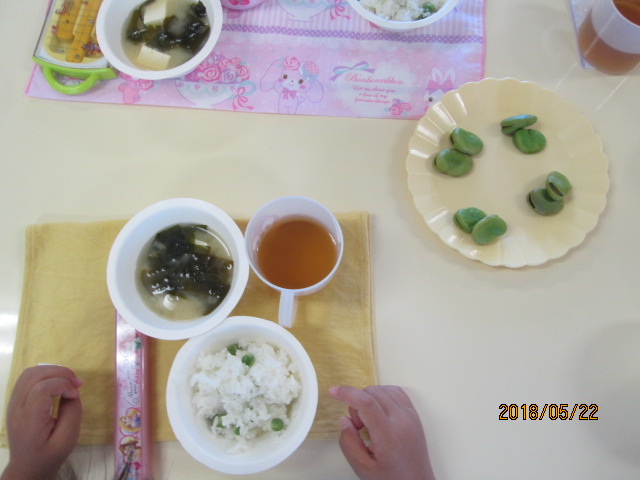 豆ごはんが炊き上がると「あ~!いいにおい!」「早く食べたい!」と待ちきれない様子で、いただきますの挨拶とともに、気持ちよく食べておかわりもしていました。