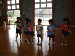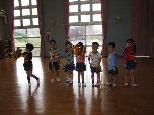 みんなで(年長児中心)曲に合わせて動きを考えながら、決めながら、踊っています。楽しすぎて笑いが止まらない子もいるくらい!みんな