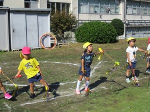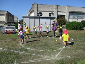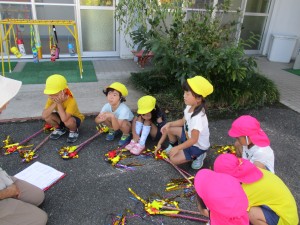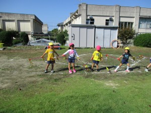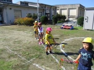 をテーマに取り組んでいきたいと思っています。そこで、こどもたちにも「となりの友達と同じスピードで歩けてるかな?」「キラキラするところ、みんなそろっていてきれい!」「声をかけ合ったらいいのかな?」とみんなで踊る楽しさや、そろえることの大切さなどが伝わるように声をかけています。振り返りのお話広場では、子どもからも「みんなで一緒にキラキラできて、きれいやった。」「順番にすわっていくところ、声に出して言ってたら分かりやすかった!」「前に歩いて行くところがちょっとばらばらになっちゃった!」という意見が出ました。