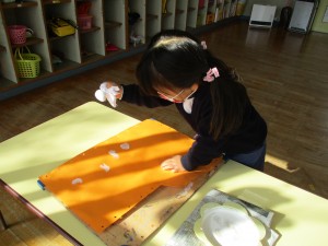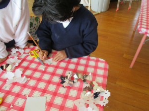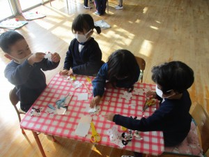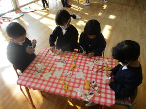 「先生!プレゼントのブーツ作っとかな!」ということで、みんな好きな色でブーツを作っています。