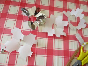 「わぁ!雪の結晶や!」「きれい」。切り絵のように作りました。友達の作品を見て、「それどんなふうにした?」「これもいい形できるよ」