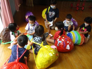 「1グループにひとつしかないからどうやって運ぶかはそうだんしてね」とポケモンからのなげかけがあったので、みんなで相談中。話し合いの結果、グループのみんなで持って運ぶことになりました。