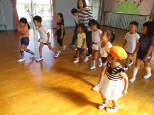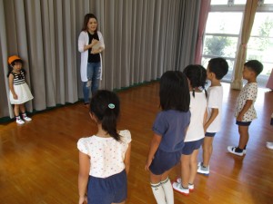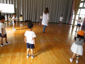 10月の英語で遊ぼうは、ハローハロー♪と始まりの歌から、動詞ジャンプ、ウォーク、シットダウン、スタンドアップなどで動いて遊んだあと、おおかみさん何時❔ゲームを英語でしました。「ウルフ、ウルフ、ワットタイムイズイット?」と子羊役が聞いていき、オオカミ役が「ワン」「フォー」など答えていき、「トゥエルブ(12時=お昼ご飯の時間)と答えたら、逃げるゲームです。