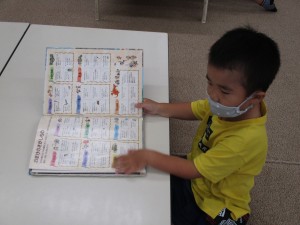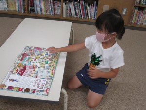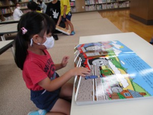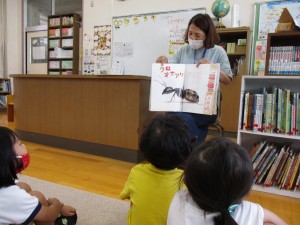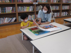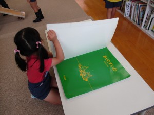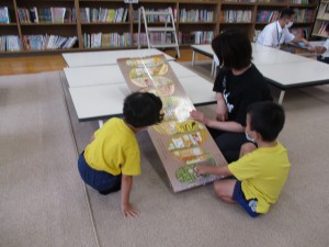 運動会の紙芝居など、楽しいお話を読んでもらいました。それから、自由に自分の興味を持った本を手に取り楽しみました。
