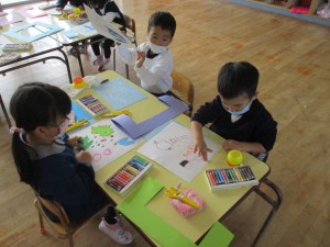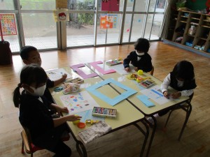 12月になり、改めて、ノリのつける部分に合った分量を考えたり、しっかり伸ばして塗れたり、また、クレパスの丁寧に塗り込むことが出来たりと、道具の使い方もしっかり身についてきたなと感じました。