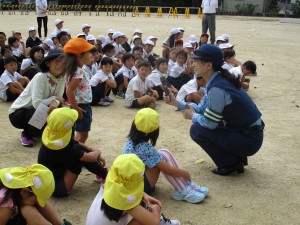 クイズには、幼稚園の子も積極的に手をあげて発言しました。歩行訓練では、しっかり右左右をみてから進むこと、車が止まっているときは