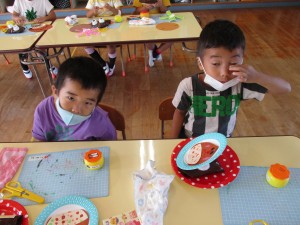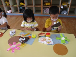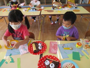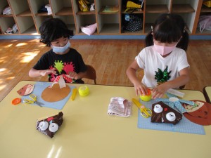 るべく細く切ることを意識して、作りました。年中児は、教師が用意した顔のパーツを貼り、いがを貼り、のりの使い方をしっかり確認しなが