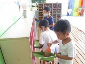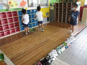 靴をきれいに並べて、靴箱をはきます!この掃除は年中さんも参加です。