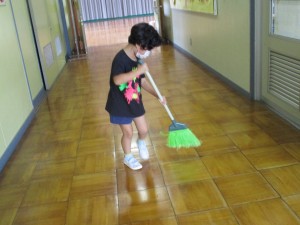 廊下もきれいにしましょう!ほうきの持ち方も板についてきました。
