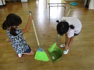 保育室は一番ゴミが多いです。2人で担当!ほうき係とちりとり係役割分担してごみを集めます。