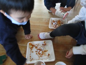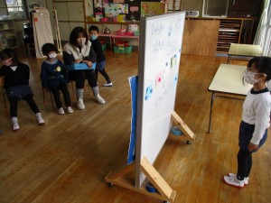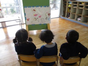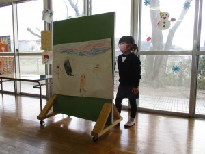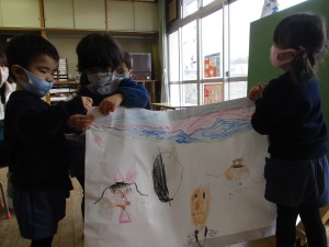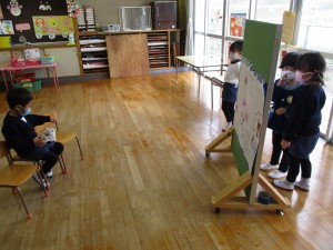 映画館ごっこが盛り上がってきています。一人一枚で描いていた姿が、何人かで一枚の場面を仕上げ、一緒に話を考えて、台詞を役割分担して
