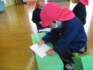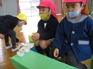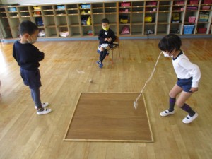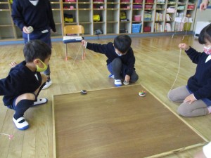 お互いにがんばれ!まわれっ!と応援しあっていました。また、年長さんが紐をこまにまいていく時には、年中さんも真剣に見守っていました。
