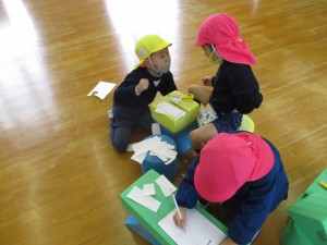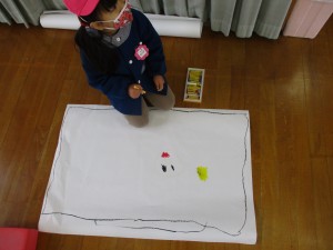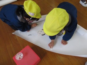 映画作ってみようということになり、一生懸命大きな紙に映画のお話を考えて描いていました。すると、周りの子が、ここはチケット予約のところです!ポップコーンも売ろう!と次々集まって来て、みんなで同じイメージを持って、映画館ごっこが始まりました。