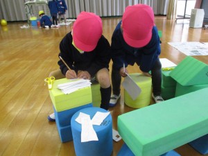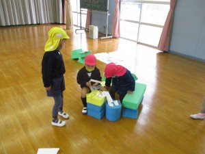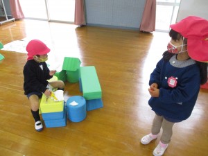 一人の年中さんが、ウレタン積み木をいくつか並べ、「映画館のいすです」というつぶやきから、