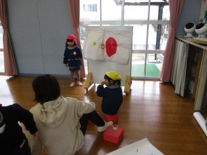 みんなおいしいポップコーンとともに楽しいお話の映画を楽しみました。すると横で、明日も新しい映画!とってもかわいい映画がまたはじまりますよ!楽しみにしててくださいねと、年長さんがお話を考えていました。明日も続き楽しもう!