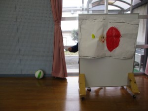 年長児・年中児のこまの種類がちがいます。そこで、今日は年齢別に順番にこま回しをしてみました。
