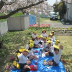 5歳児だけのお弁当の時間。「早く小さい組さんと一緒にお弁当食べたいなぁ♪」とみんな楽しみにしています。今日は暖かかったので満開の桜の下でお弁当を食べました♪