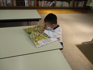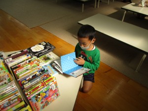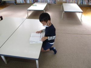 今日は、一人ずつがそれぞれ本を選び、近くの机にすわり、いっしょうけんめい本を自分で読んでいました。