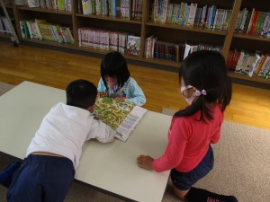 今日は、変化が!いつもこの時間になると、「先生一緒によもう!」「先生読んで」「一緒にみよう!」など声が飛び交うのですが、