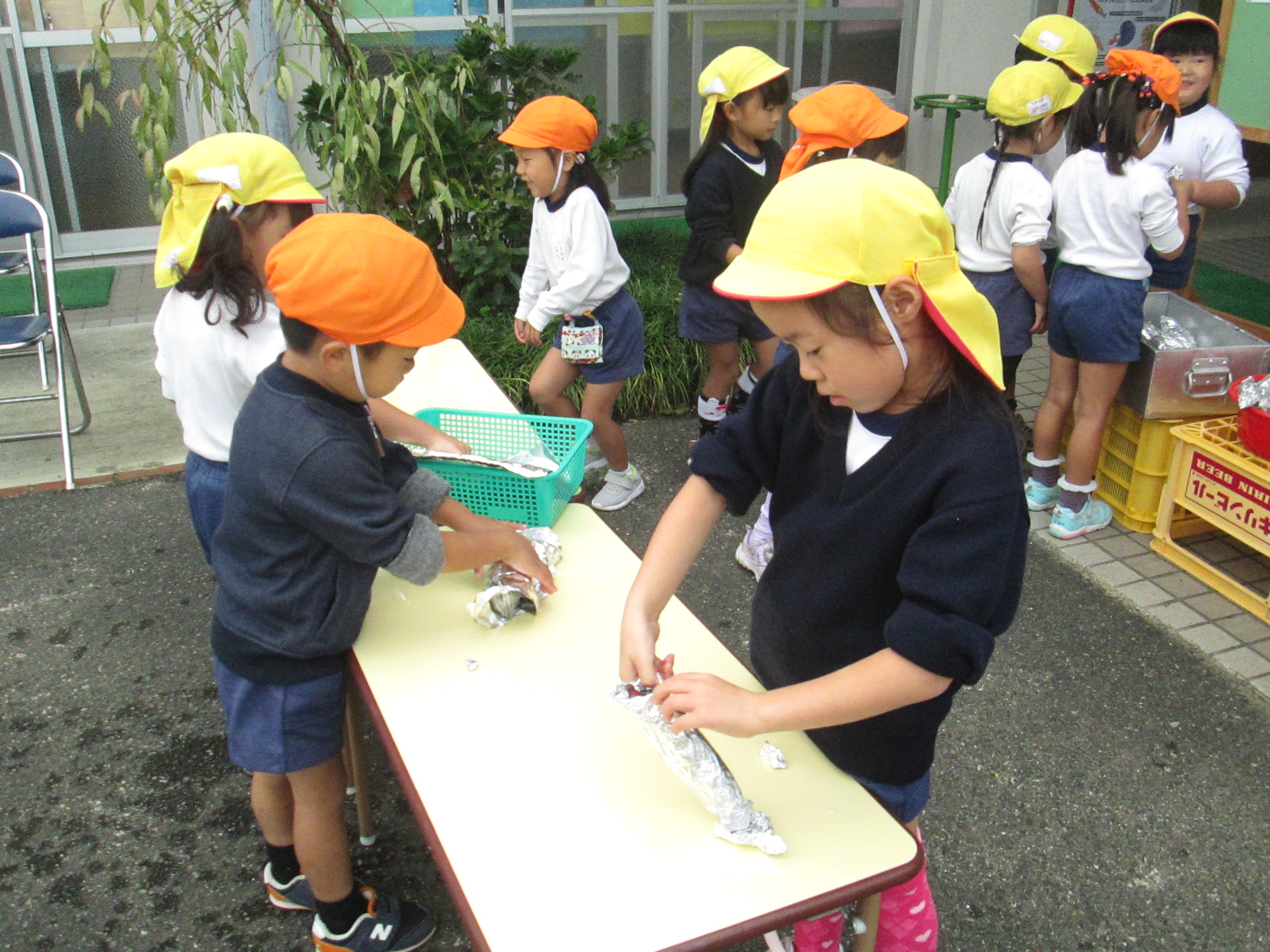 地域の虹の丘園で、掘ったさつまいもを焼き芋にして食べました。虹の丘園の方々もご招待して、焼き芋が焼けるまでいっしょに遊んで待ちました。自分で新聞紙やアルミホイルでつつみ、出来たてふかふか♡ほかほか♡の焼き芋の味は最高でした!!