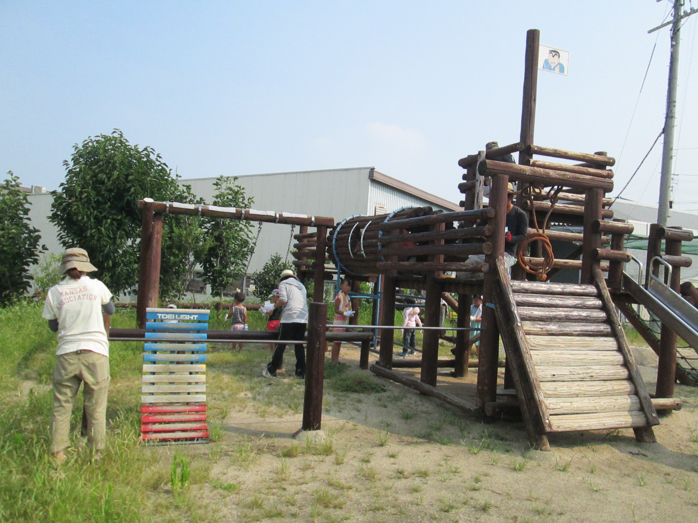 木製遊具にペンキを塗ったり、草ぬきをしたりと、