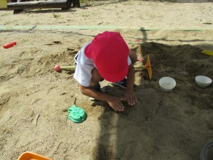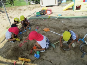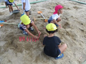 砂場で前まではダイナミックに山や川、トンネルなど作っていたみんなですが、変化が!
