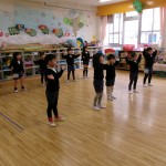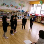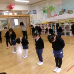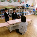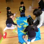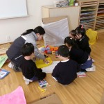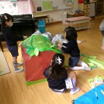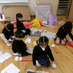 生活発表会に向けて取り組んでいます。当日、発表する部屋でも少しずつ練習を始めています。劇では、お話の内容も少しずつ出来てきて、役になりきってセリフが出てくる姿も見られてきました。また、お話が進んでくると、必要なものが新たに出てきて、グループの友達と協力して作っています。