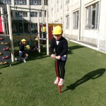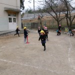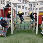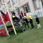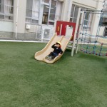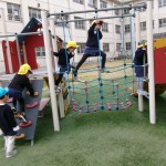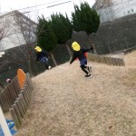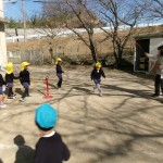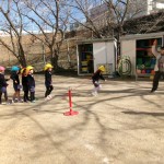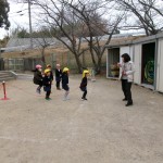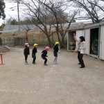 マラソンサーキットでたっぷり体を動かして遊んでいます。走ったり、マラソンのコースにある遊具やスクーターをしたりしながら元気いっぱい取り組んでいます。また、ホッピングや短縄や長繩などに繰り返し挑戦しています。長縄では、止まらずに連続で通り抜けをしたり、友達数人で一緒に跳んだりなど、友達と協力して挑戦する姿がたくさん見られています。