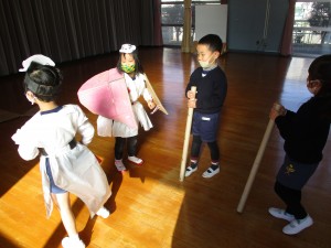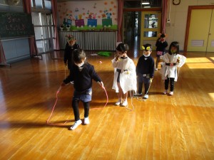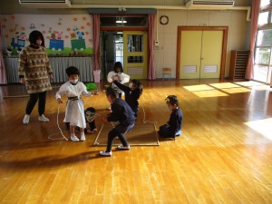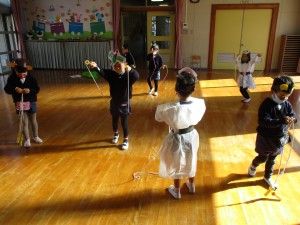 今日の鬼もこまが回る音と、回るものを見ることが苦手!着物や動物の耳をつけて、なりきりながらみんなで鬼を倒すために心を一つに、それぞれが頑張って回しました。すると、今日は年長さんが全員、紐をまくところから、投げることまで全部自分でして、こまを回すことが出来ました!!大興奮で、「まわった~」すると、意欲がぐっとわき、もう一回もう一回としていると、あっ鬼が倒れてる!