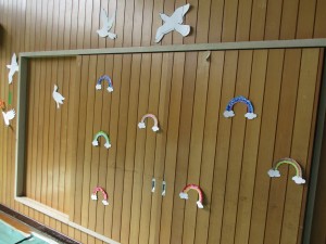 体育館には1年生から5年生の作った飾りが飾られていました。その中に、みんなが5年生に教えてもらって一緒に作った作品も!!