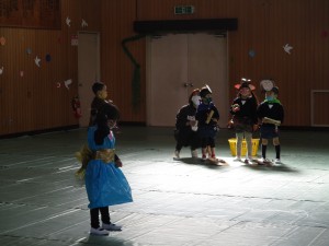 幼稚園からは、「お兄さんお姉さん 優しくしてくれてありがとうございました。中学校に行っても元気にがんばってください」のメッセージと発表会でしたももたろうの劇の一部分を演じ、ももたろう音頭を踊って楽しんでもらいました。