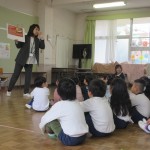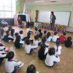 集会室に集まり、園長先生からのお話を聞きました。