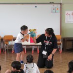 かわいいワンワンの人形でさっそく歯みがきの練習です。お話をしっかり聞いていたので、上手!!