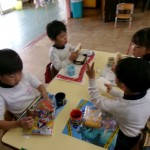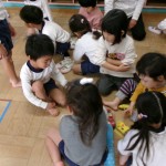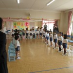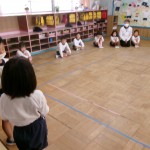 そのあと、部屋に年少さんが来て、一緒にリズム遊びを楽しみました。靴下の脱ぎ方を教えてあげたり、見本を見せたりして、しっかりとお兄さん・お姉さんになっていました。