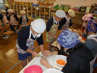 幼稚園で収穫した大根、蕪を使ってお雑煮を作りました。