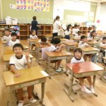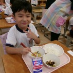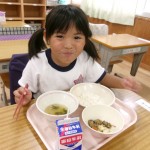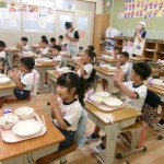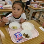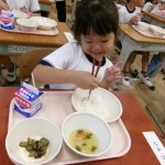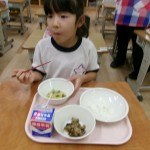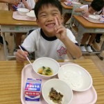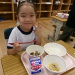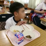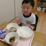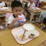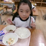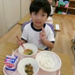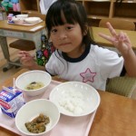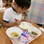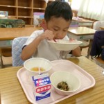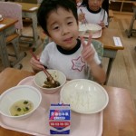 今日は体験給食でした。1年生の教室で座り方や話し方、聞き方などについてもお話を聞きました。1年生のように座っていると・・・クンクンクン何だかいい匂い~♡給食の先生が美味しい給食を運んできてくれました。お野菜がたっぷり入ったスープやマーボーなす…今日のメニューは、お野菜がゴロゴロ入っているから幼稚園さん食べれるかな~という給食の先生の心配をよそに、ニッコニコの笑顔で「めーっちゃくちゃおいしい!」パクパクパク・・・おいしすぎて黙々と食べ始める子ども達!(^^)!「おかわりいってもいい?」「まだまだお腹すいてるー!」とモリモリ食べて大満足で体験給食を終えました。前回苦手そうにしていた子も経験を積むことでモリモリ食べるようになっていて、体験給食のすばらしさを感じました。