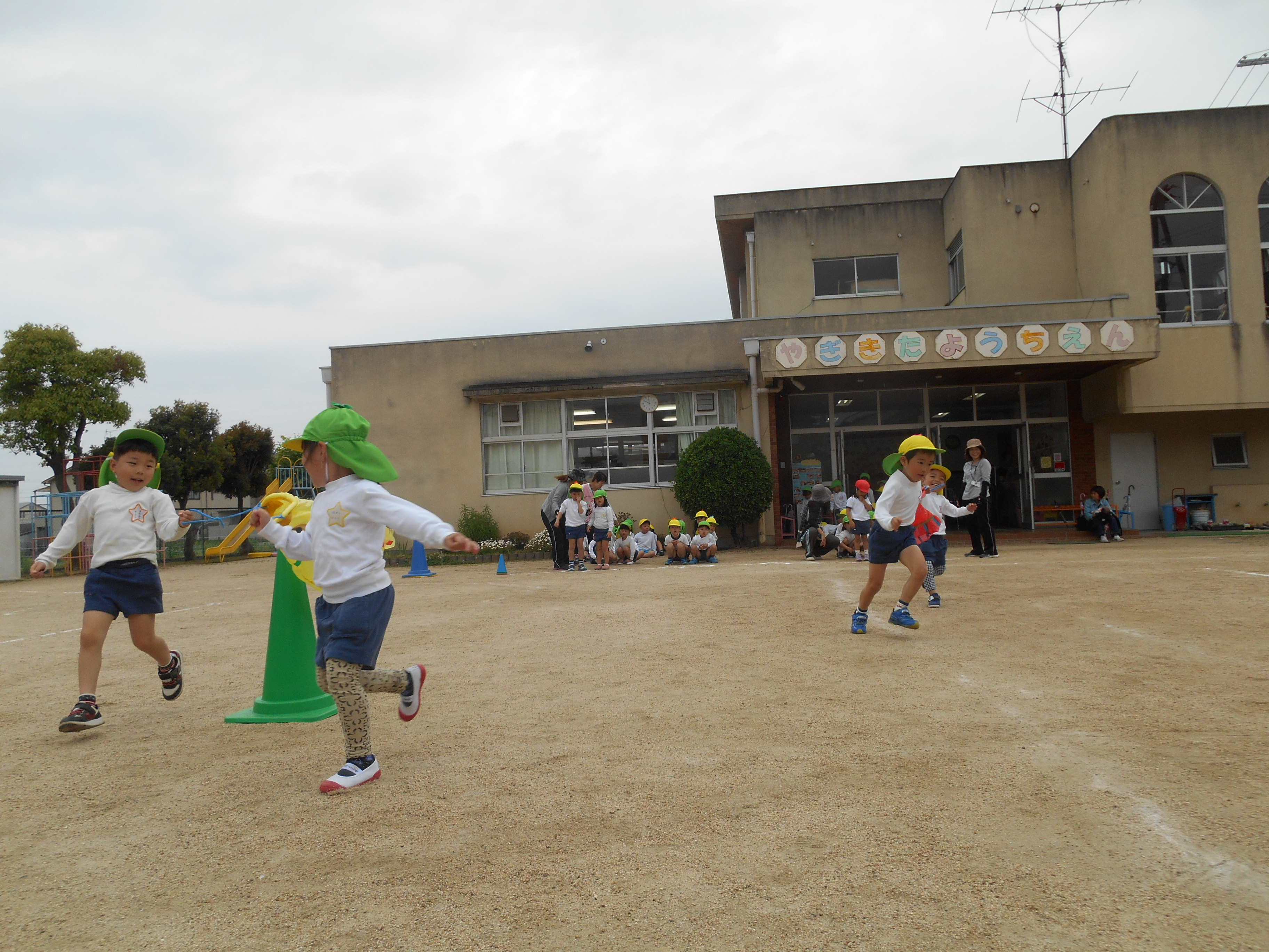 | 「位置について、よ~い、どん!」年長児は友達と競う楽しみを味わいながら、年中児は最後まで力いっぱい |