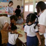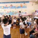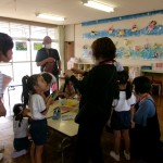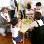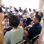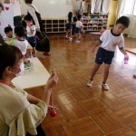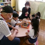 みんなで一緒に歌を歌ったり、触れ合い遊びをした後、第2部では、あやとりやこま回し、お手玉、おりがみなどいろいろな遊びを楽しみました。そして最後は、普段遊んでいるリトミックや触れ合いじゃんけん遊びもしてもらって大喜びの子ども達(^^♪おじいちゃんおばあちゃんが来れなかった子も友達のおじいちゃんおばあちゃんと一緒にペアになって遊んでいただきました。穏やかな楽しい時間を本当にありがとうございました!!
