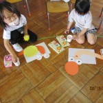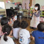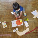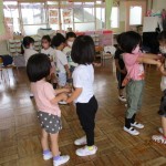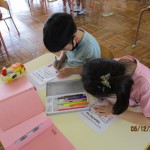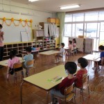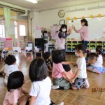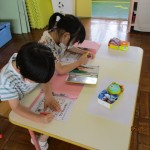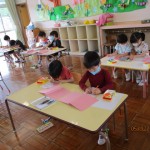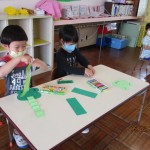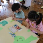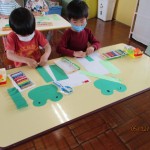 フレンドタイムでは年長児は「歌のアルバム」に取り組んだり「カエル」の製作をしたりしました。年中児は「カタツムリ」の製作をしたり、リズム遊びをしたりしました。