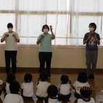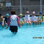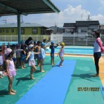 七夕の日にちなんで、たなばたさまの歌を歌ったり、七夕のお話を聞いたりしました。先生たちのベル演奏「きらきらぼし」を聴いたり、この季節にちなんで「ドラえもん」の曲で盆踊りをしました!手作りうちわももって踊りました!また今日は初めてのプール遊びの日でした!楽しくて、水の感触が気持ちよくて、笑顔いっぱいな子ども達でした!